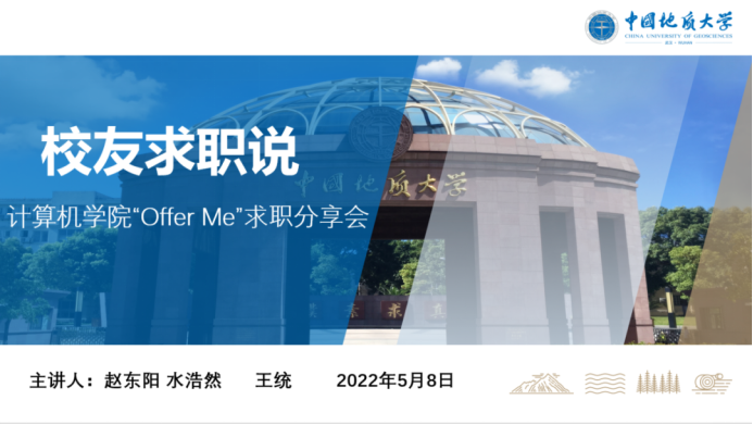 (通讯员:顾伟超)十大买球官方网站“Offer Me”分享会之“校友求职说”专场活动于5月8日成功举行。本次活动邀请到3位来自不同行业的校友:2021届计算机科学与技术硕士专业毕业生赵东阳,目前就职于中国建设银行湖北分行;2020届计算机技术硕士专业毕业生水浩然,目前就职于中国航天科工集团第二研究院706所;2021届计算机科学与技术硕士专业毕业生王统,目前就职于成都市公安局,在线分享他们的职业选择、求职规划与工作感受。学院团委书记、研究生辅导员李欢欢,2019级辅导员闫维蓉以及200余名学生参与此次分享活动,李欢欢担任主持。