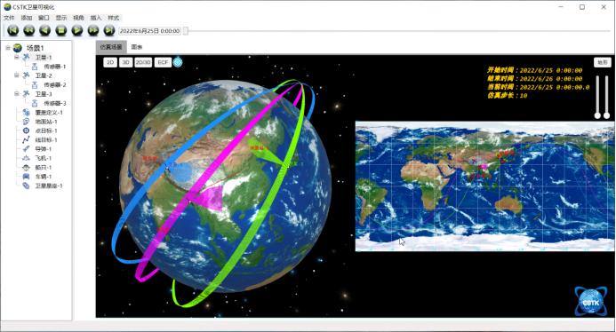 8.CSTK软件具备强大的仿真功能,支持对整个场景的二维仿真,天球系三维仿真、地固系三维仿真及墨卡托三维仿真四种典型的仿真模式。